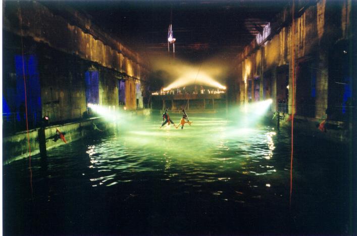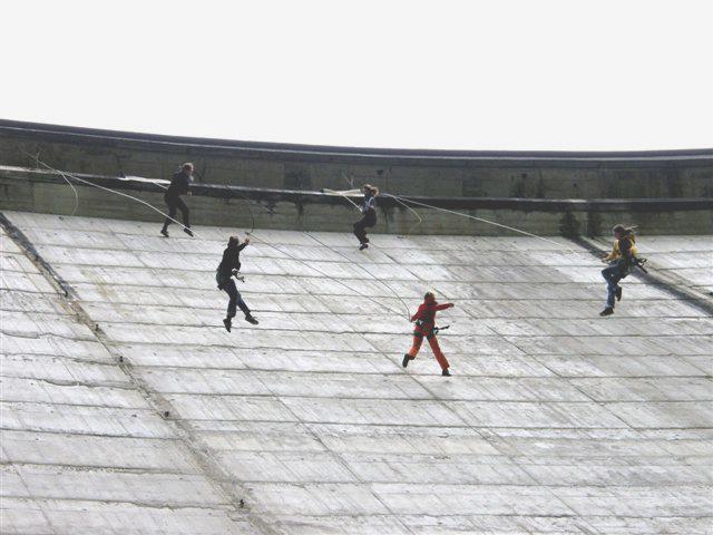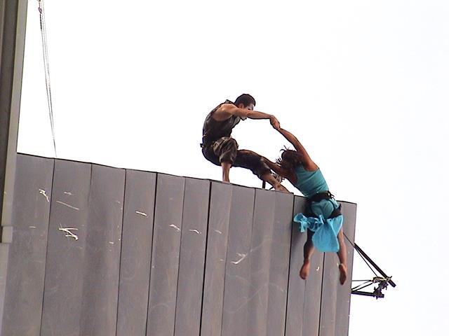 Toutes les représentations de la compagnie Adrénaline se font sur des parois verticales, suspendues par des filins, qu’ils soient accrochés à un bâtiment du patrimoine architectural, une tour en béton, un pont, etc.
